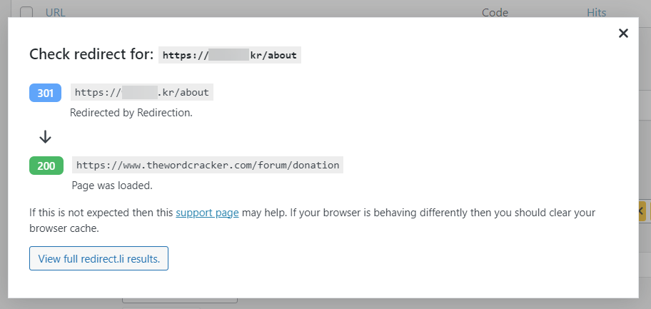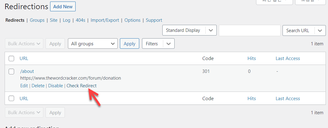 Check Redirect를 클릭하여 리디렉션이 제대로 작동하는지 확인할 수 있습니다.