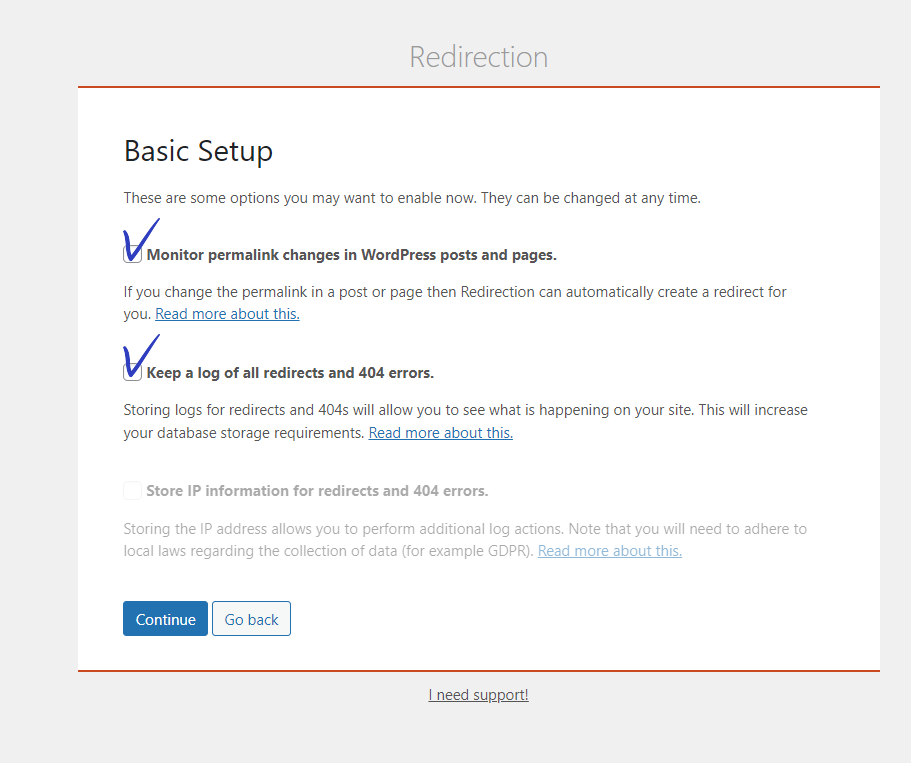 Keep a log of all redirects and 404 errors를 체크하면 리다이렉트와 404에 대한 로그가 보관됩니다.