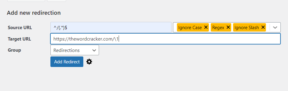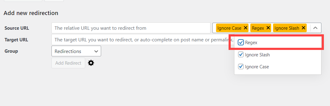 일괄적으로 리디렉션을 설정하기를 원하는 경우에는 정규 표현식(Regular Expression)을 활성화하여 정규식을 이용하여 리디렉션을 설정할 수 있습니다.