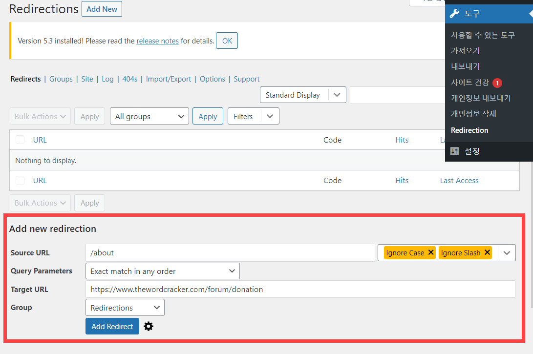 리디렉션을 추가하려면 도구 » Redirection으로 이동합니다.