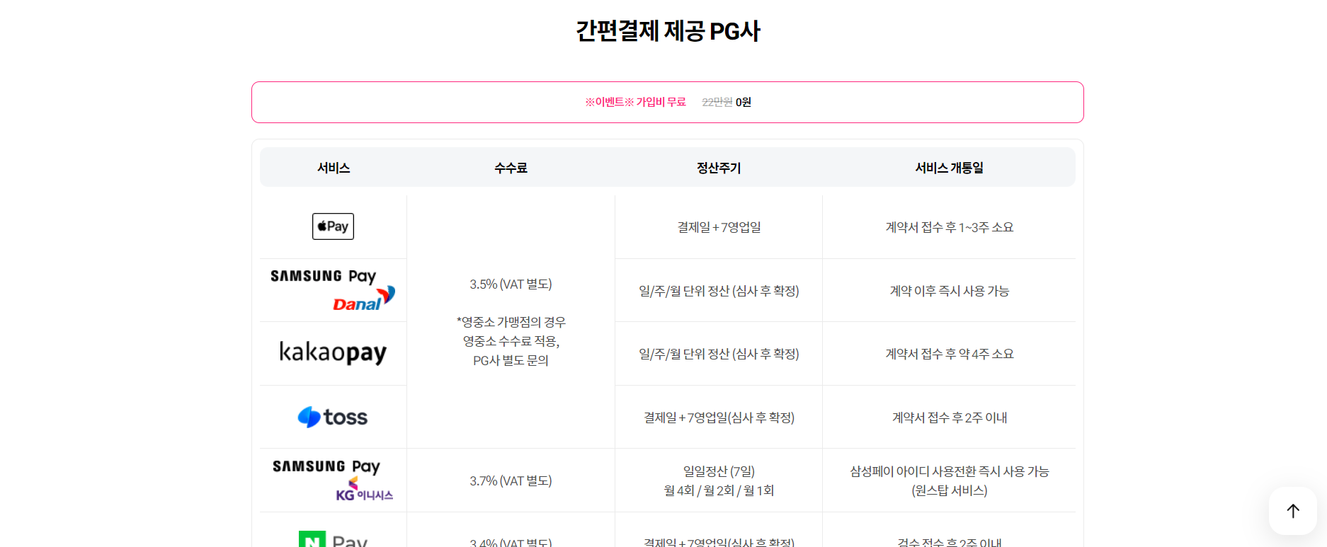 “바로 오픈 PG” 서비스가 있어 심사 없이 바로 사용 가능하다고 하네요. 당일 세팅이 가능하지만 20만원을 결제해야 합니다. 간편결제는 페이코, 삼성페이, 네이버페이, 스마일페이 4가지 연동 가능합니다.