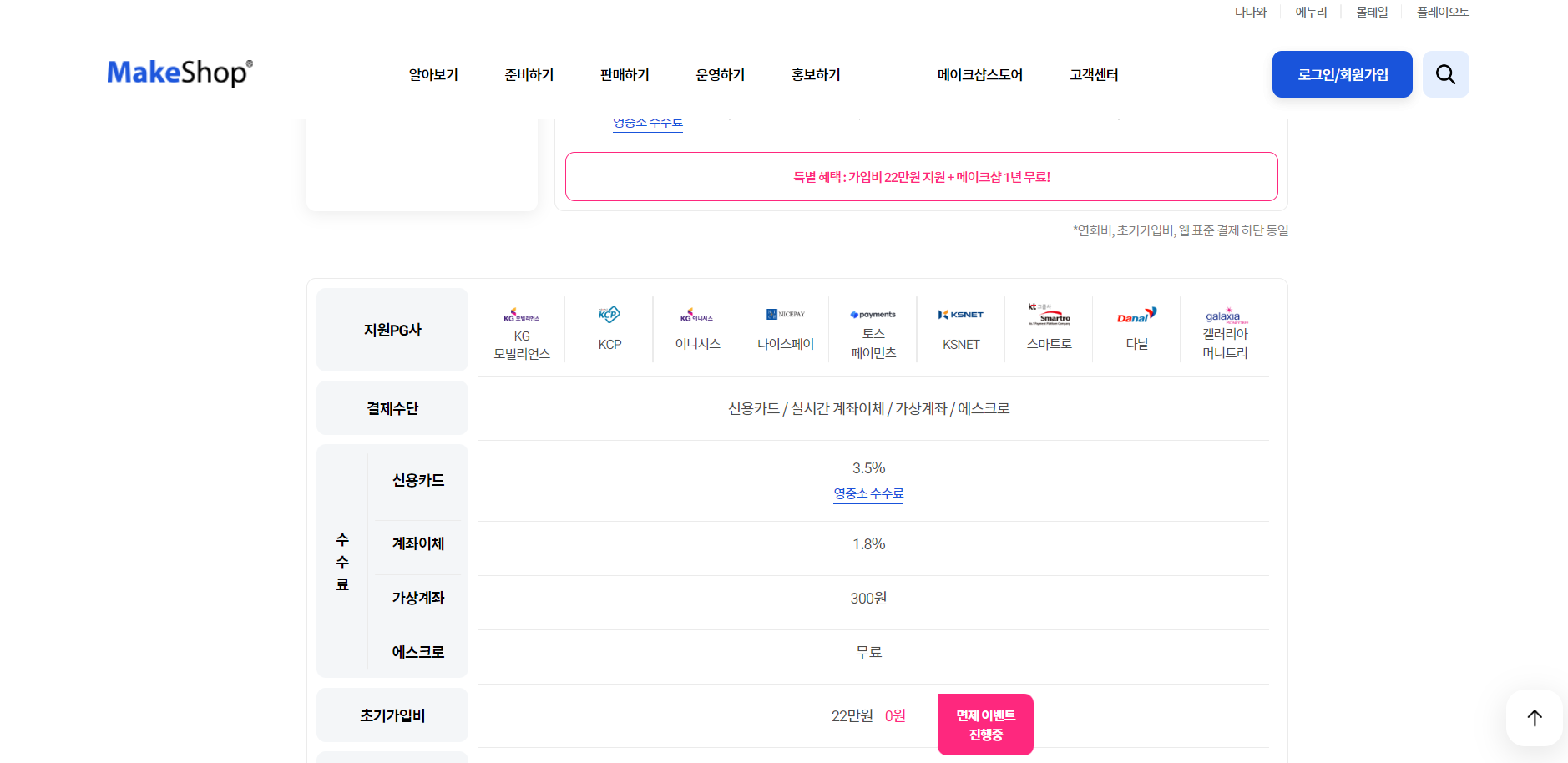 PG 수수료는 오픈마켓이 아닌 이상, 자사몰 솔루션별 수수료는 비슷합니다. 물론 매출이 많이 나는 경우 유의미한 차이겠지만 창업 초기의 경우 수수료보다는 결제 가입비를 지원 없이 결제한다면 20만원씩 나가서 이 부분을 고려해야 합니다.