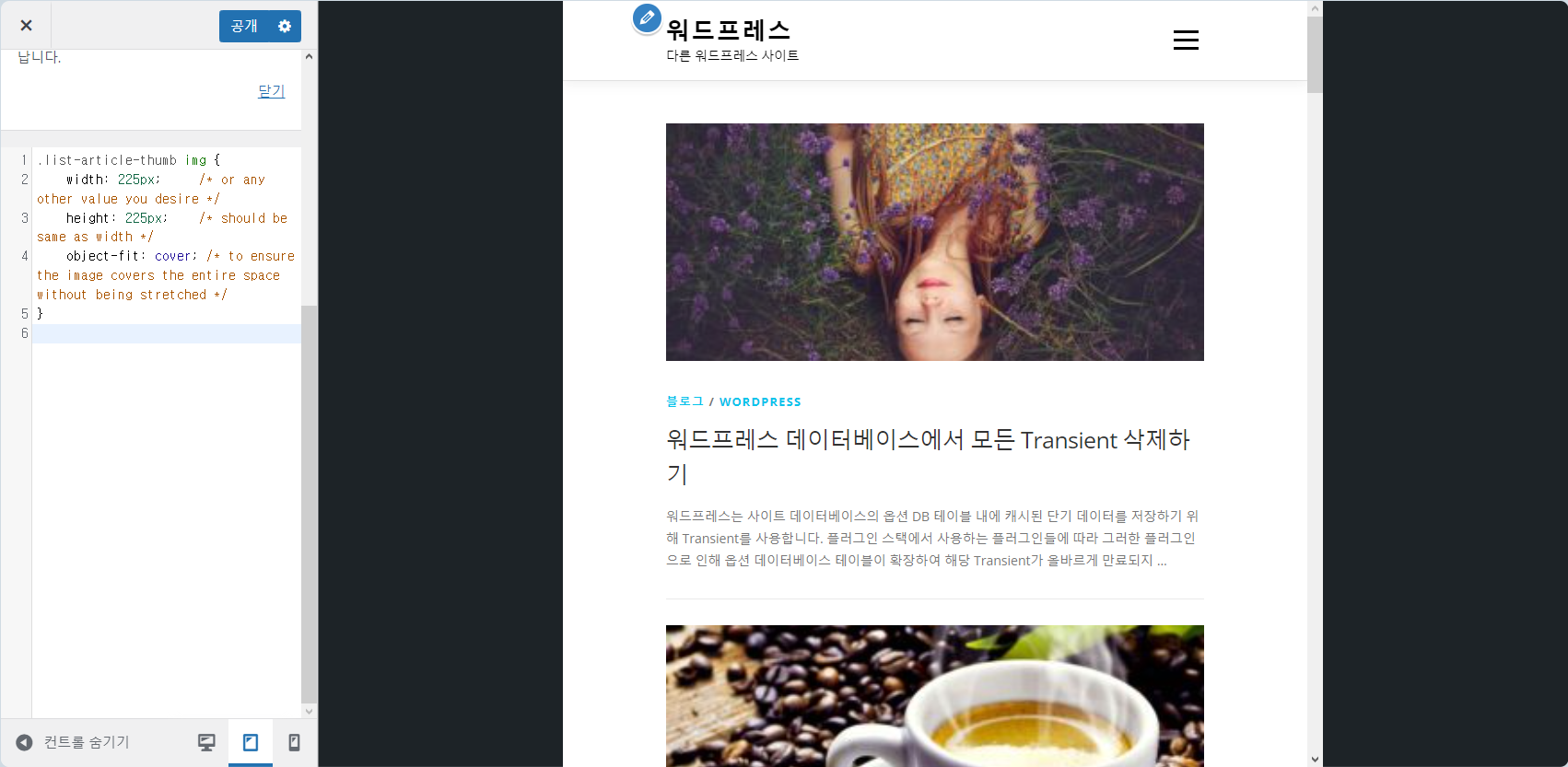 상기 코드를 모양 (외모) » 사용자 정의하기 » 추가 CSS에 추가합니다.