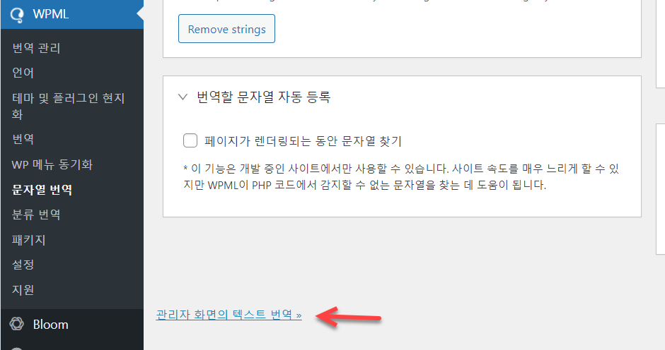 2. 아래로 스크롤하여 "관리자 화면의 텍스트 번역 » (Translate texts in admin screens »)" 링크를 클릭합니다.