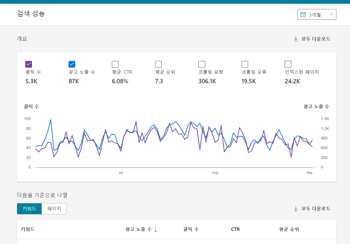 48시간 정도 지나야 검색 성능 페이지에서 클릭 수, 광고 노출 수, 검색 키워드 등의 정보를 확인할 수 있습니다.
