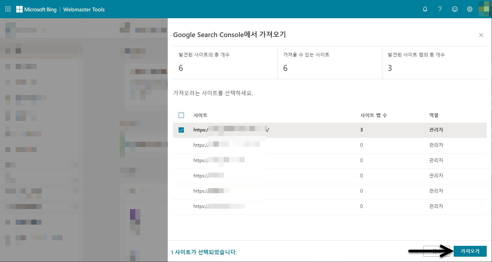 가져올 사이트를 선택하고 가져오기 버튼을 클릭합니다.