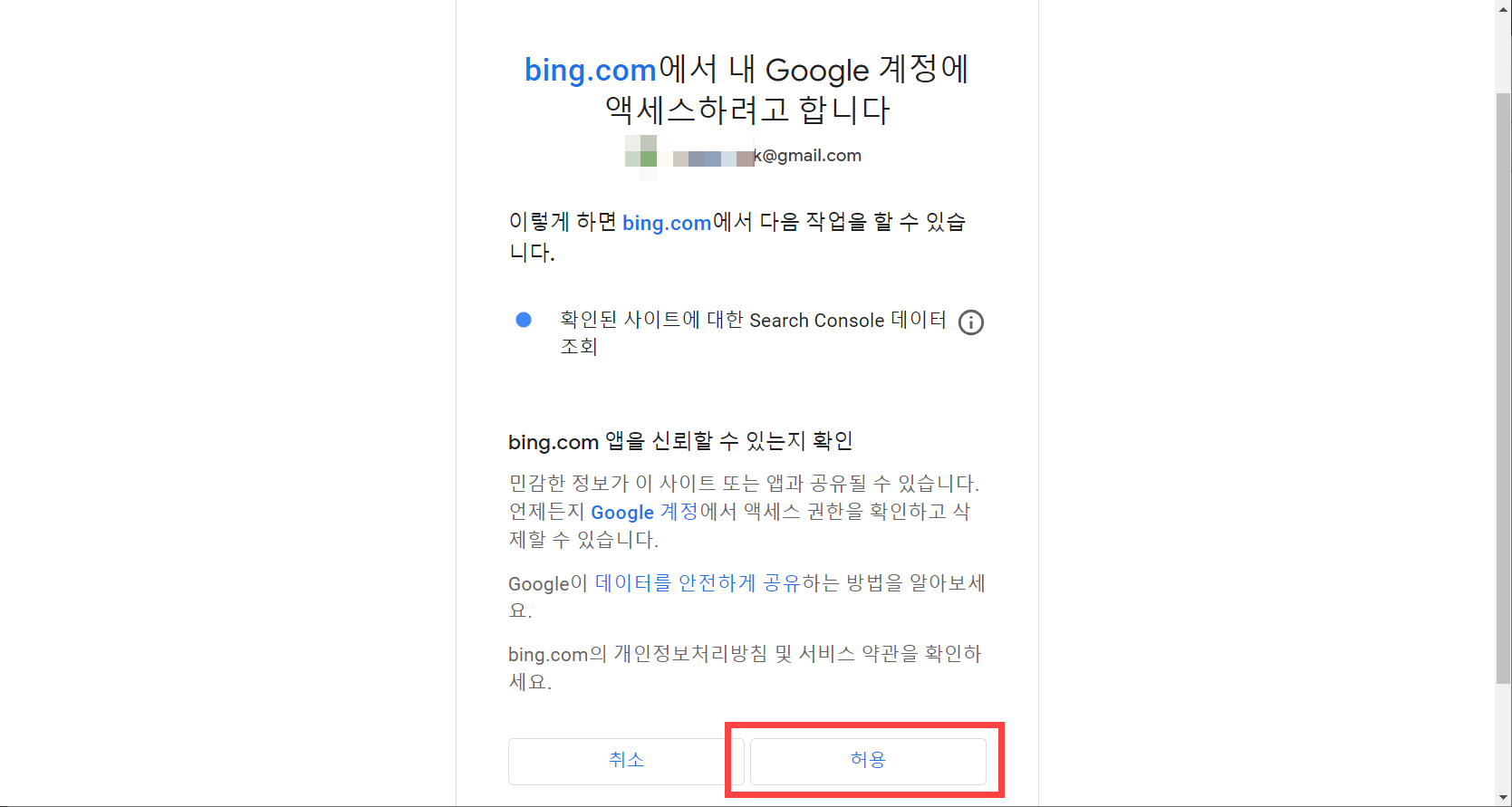 bing.com에서 내 Google 계정에 액세스하려고 합니다 메시지가 표시되면서 액세스를 허용하도록 요청하는 화면이 표시되면 하단의 허용 버튼을 클릭하여 권한을 허용합니다.