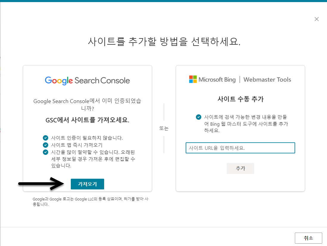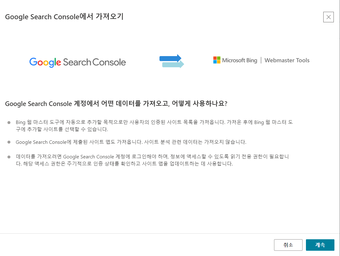 사이트가 구글 서치 콘솔에 등록되어 있다면 빙(Bing) 웹마스터 도구에서는 구글 계정 연동으로 쉽게 사이트를 등록할 수 있습니다.