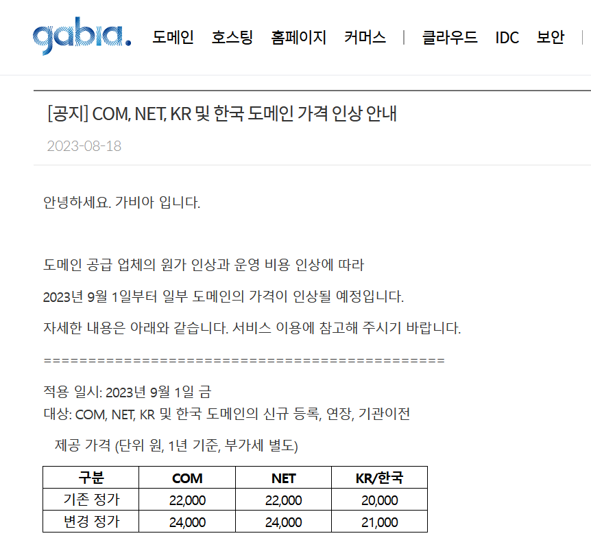 가비아는 9월 1일부터 닷컴 도메인의 등록비를 22,000원에서 24,000원으로 인상했습니다.