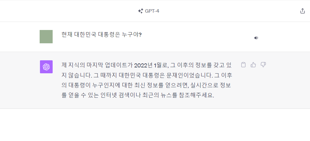 GPT-4에서 "현재 대한민국 대통령이 누구냐?"라고 질문하면 "제 지식의 마지막 업데이트가 2022년 1월로, 그 이후의 정보를 갖고 있지 않습니다."라는 답변과 함께 당시 대통령 이름을 알려주고 현재 대통령 이름은 알려주지 않습니다.