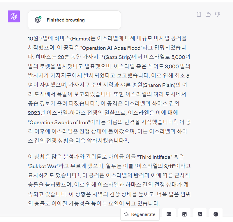 최근 하마스의 이스라엘에 대한 미사일 폭격에 대한 질문을 해보니 어느 정도 정확한 정보를 제공하는 것 같습니다.