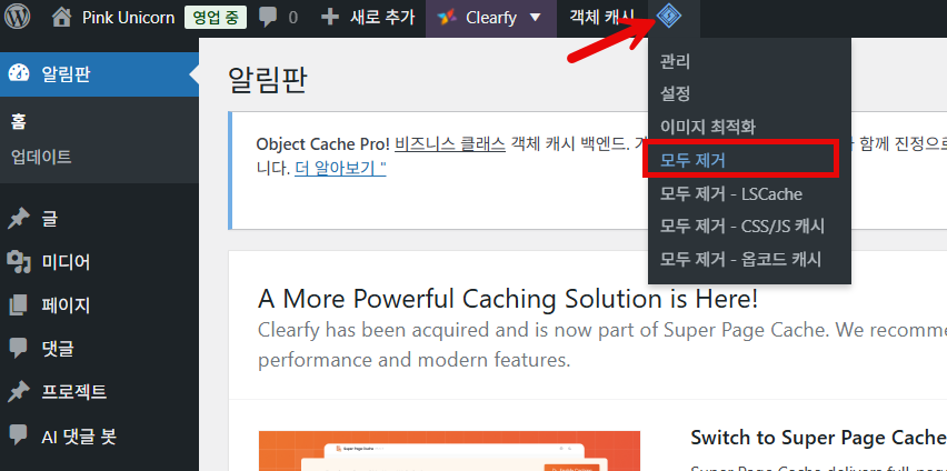 LiteSpeed Cache 플러그인을 사용하는 경우에도 비슷한 방법으로 캐시를 삭제할 수 있습니다. 상단의 LiteSpeed Cache 플러그인 아이콘 위에 마우스를 올린 다음, 모두 삭제를 선택하여 캐시를 모두 지울 수 있습니다.