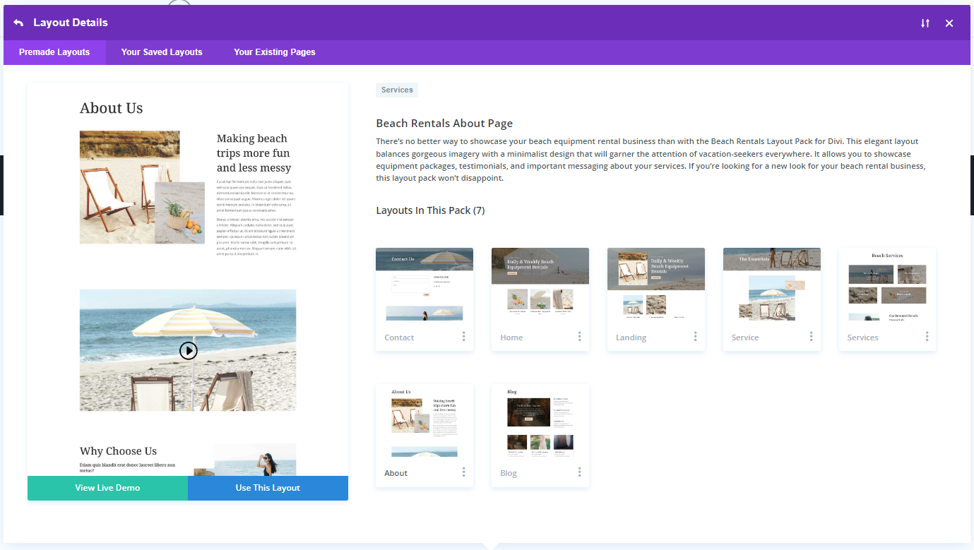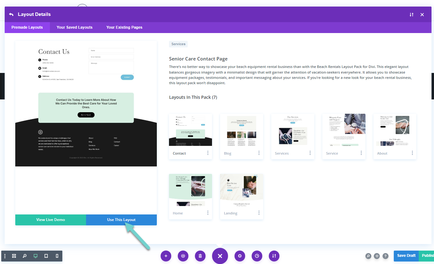View Live Demo를 클릭하면 Elegant Themes 사이트에서 해당 데모를 볼 수 있습니다. Use This Layout을 클릭하면 레이아웃이 로드됩니다.
