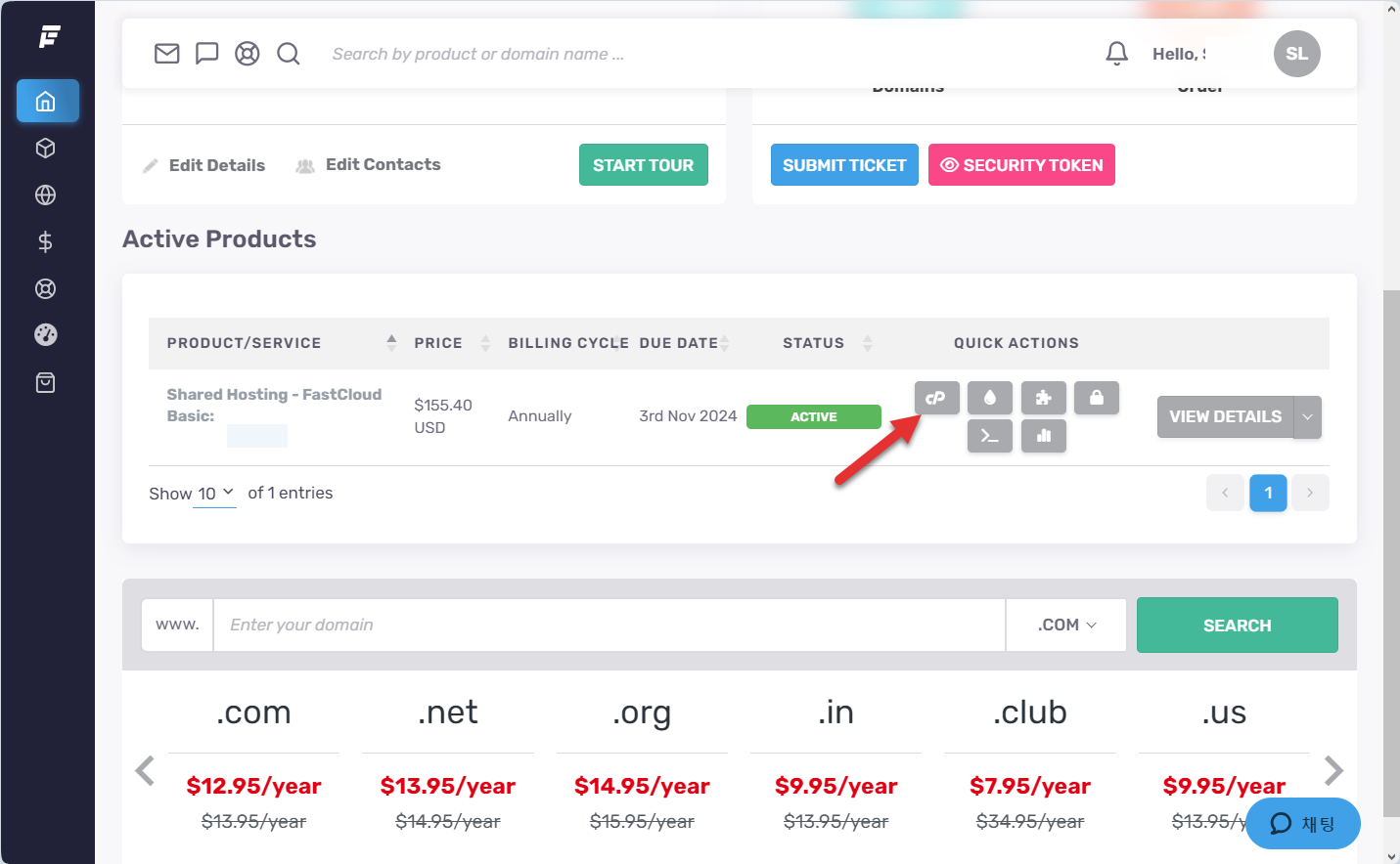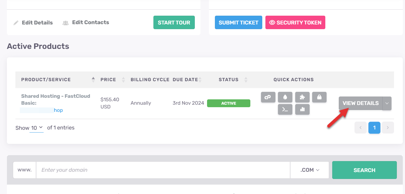 cPanel URL, 아이디 및 비밀번호를 확인하려면 상품 리스트에서 VIEW DETAILS를 클릭합니다.