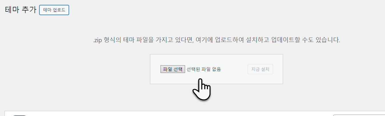 테마 추가 화면이 표시되면 파일 선택 버튼을 클릭하여 앞서 다운로드한 차일드 테마 설치 파일(generatepress_child.zip)을 지정하거나 파일을 마우스로 끌어다 파일 선택 버튼에 놓은 다음, 지금 설치 버튼을 클릭합니다.