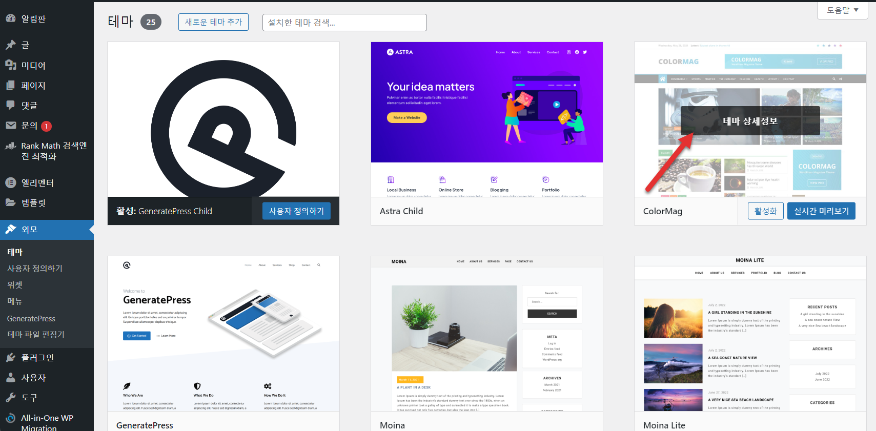 먼저 GeneratePress 테마가 설치되어 있어야 합니다.