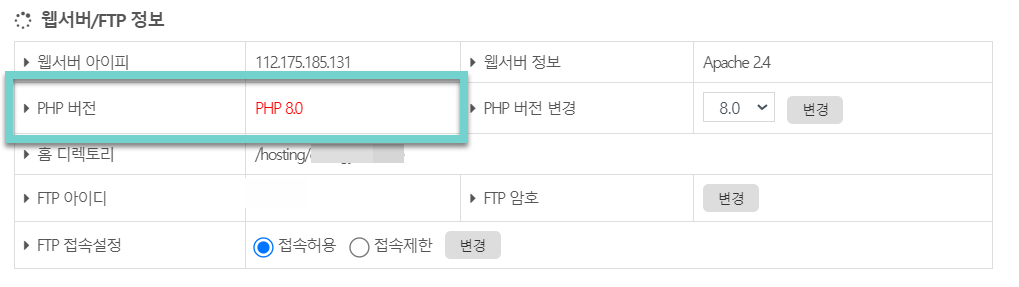 닷홈에서 PHP 버전을 8.2로 변경했다고 합니다. 위의 그림에서는 PHP 버전이 8.0으로 표시되고 있네요.