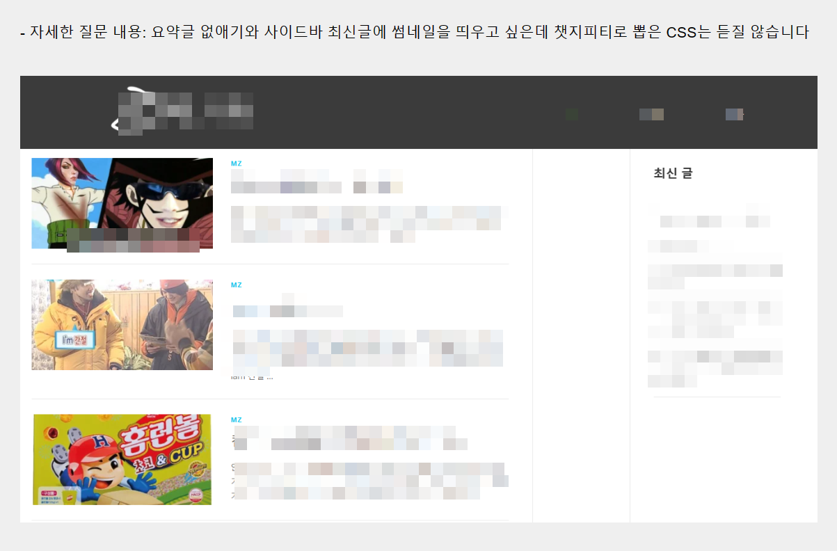 최신 글을 전면 페이지(홈)에 표시하는 경우 전면 페이지에서 요약글을 제거하려면 다음 CSS 코드를 사용할 수 있습니다.