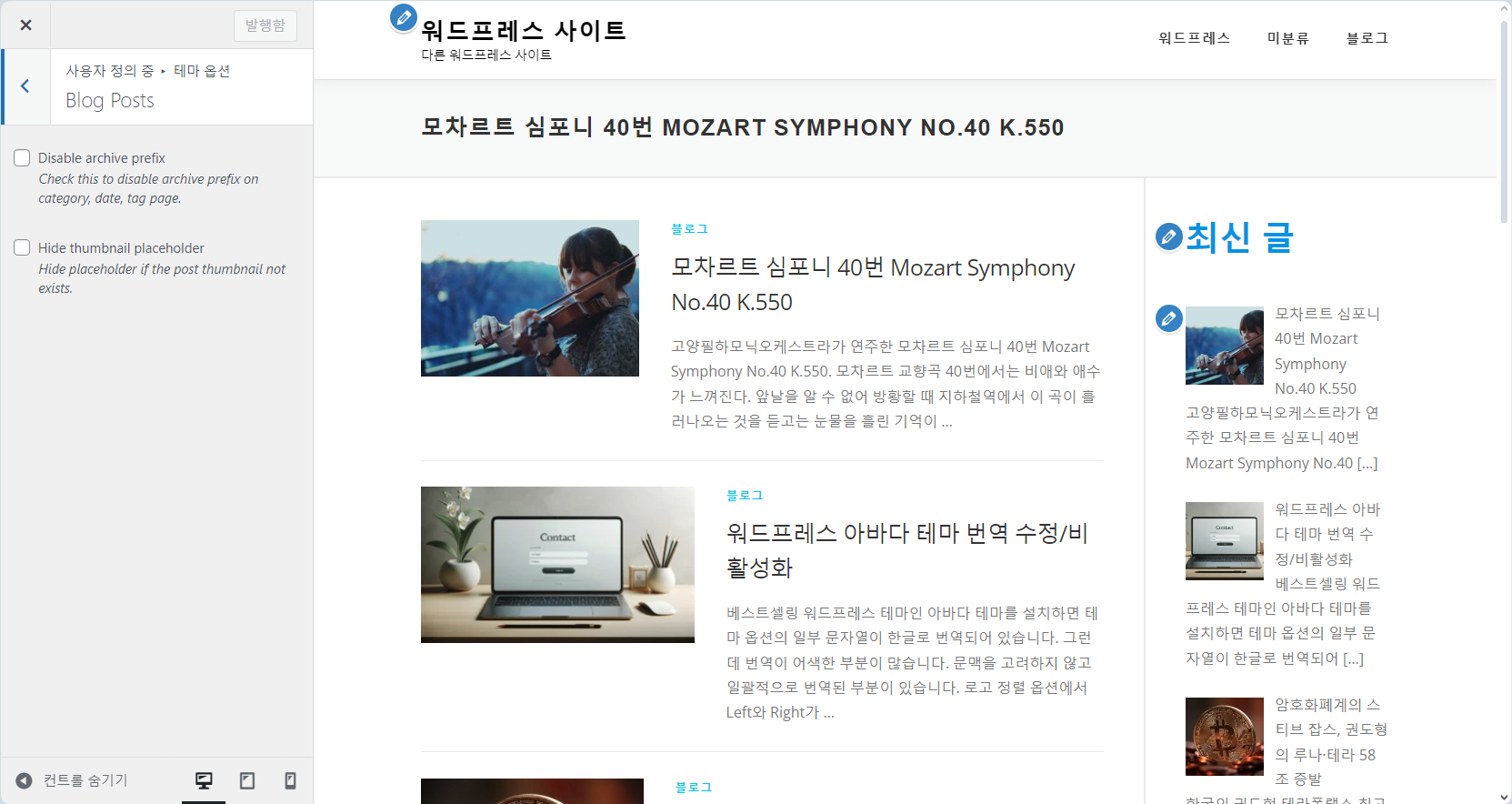 OnePress 테마도 비슷한 것 같습니다. 무료 버전에서는 설정이 제한되어 있습니다. 사용자 정의하기 내의 블로그 페이지 관련 설정을 살펴보면 아래 그림과 같이 사실상 사용자가 설정할 수 있는 옵션이 없습니다.