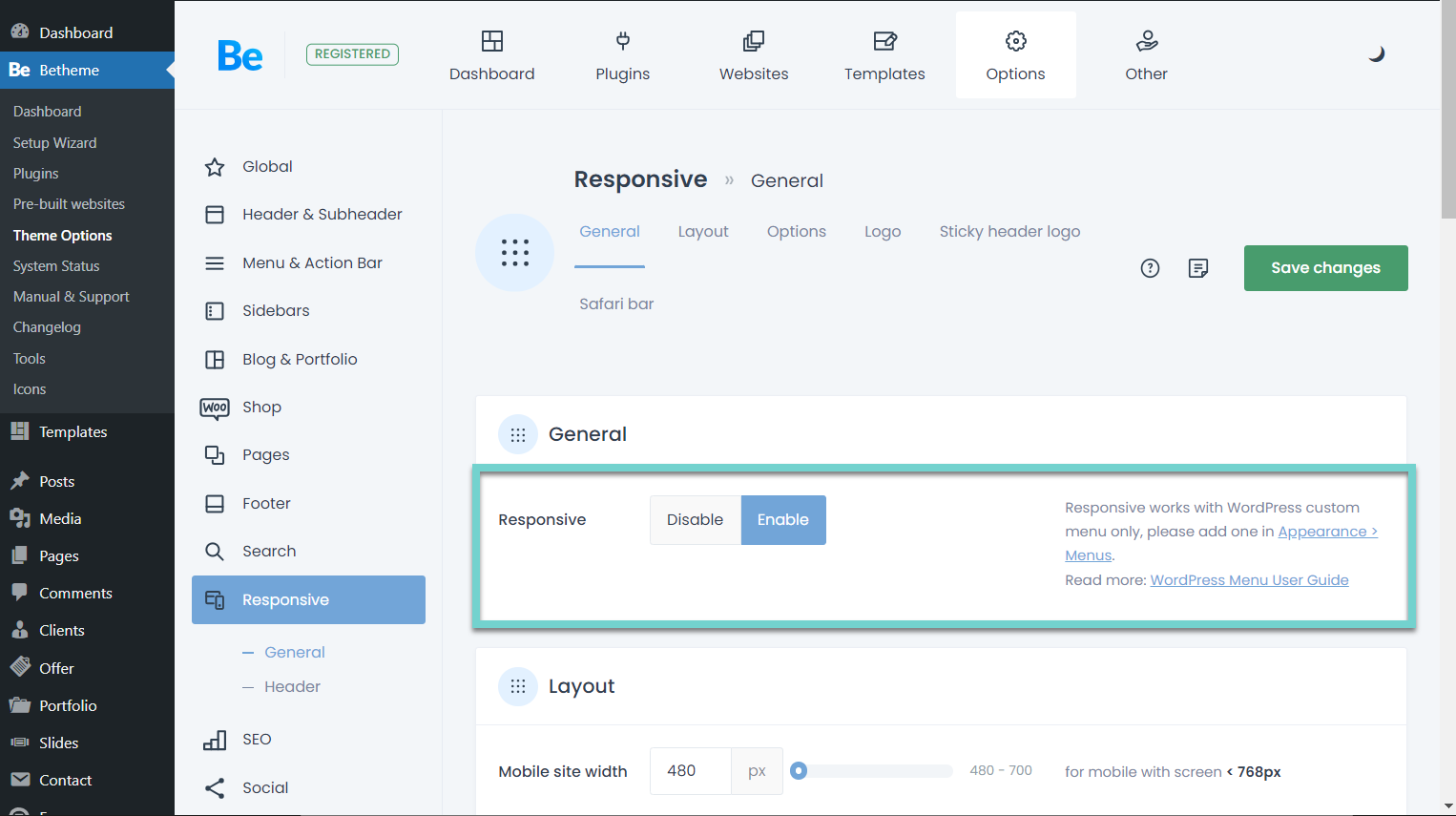 Betheme » Theme Options » Responsive » General 탭으로 이동하면 Responsive 옵션이 있습니다.