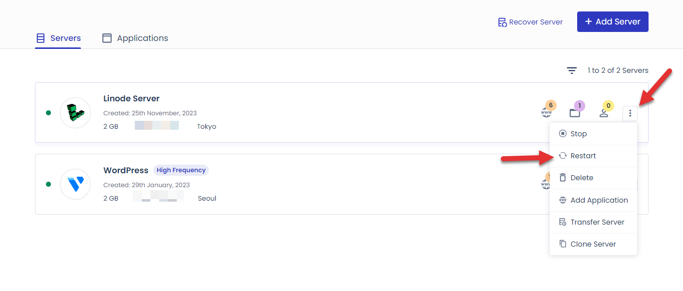서버를 재시작하려면 서버 화면에서 해당 서버의 맨 오른쪽에 있는 3개 점으로 된 아이콘을 클릭하고 Restart를 누르면 됩니다.