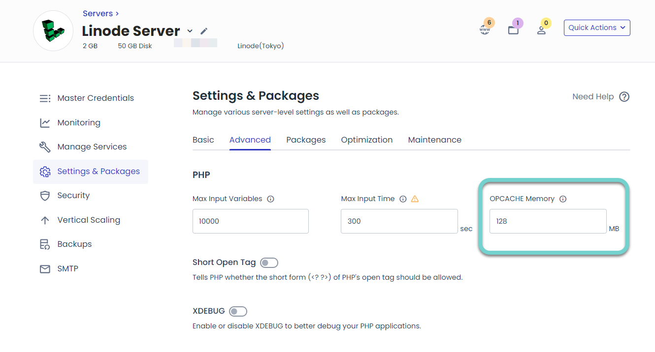 해당 서버의 Settings & Packages » Advanced 탭에서 OPCACHE 메모리 크기를 설정할 수 있습니다.