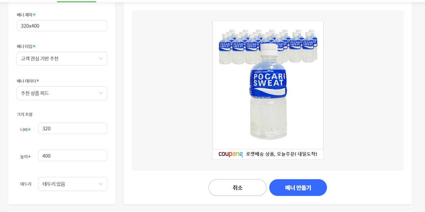 배너 타입, 배너 데이터(예: 추천 상품 피드), 배너 너비, 높이 등을 설정하여 배너를 만들 수 있습니다.