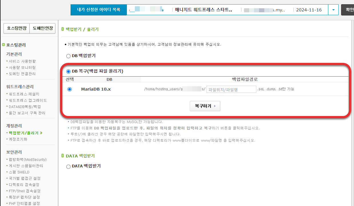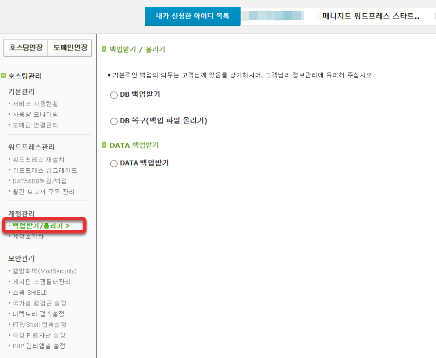 호스팅관리 » 계정관리 » 백업받기/올리기에서 DB와 DATA를 백업받아 컴퓨터로 다운로드하도록 합니다.