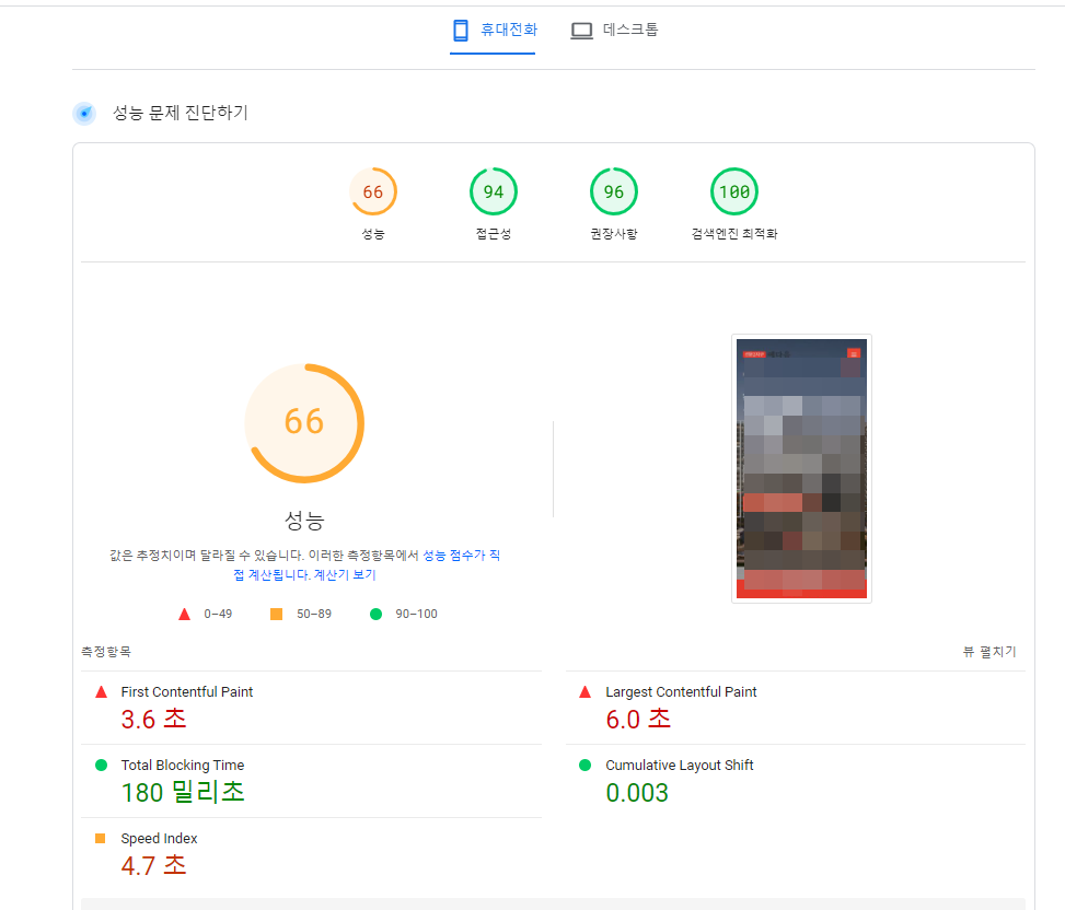 구글 페이지 스피드 인사이트 사이트에서 속도를 측정해 보면 데스크톱에서는 점수가 높게 나오지만 모바일에서 점수가 낮게 나오는 경우가 많은 것 같습니다.