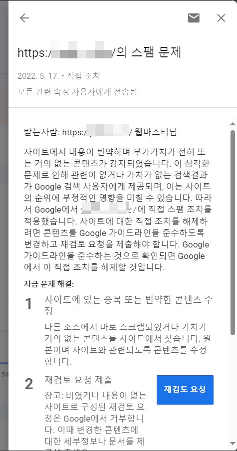 저는 여러 번 재검토 요청을 했지만 해결되지 않아서 구글 계정에서 사이트를 삭제하고, 다른 구글 계정에 사이트를 다시 등록해 보았습니다.