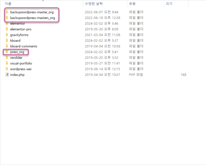 FTP를 통해 접속하니 플러그인 폴더에 _org로 끝나는 플러그인들이 있었고, 백업본 압축을 윈도우에서 해제하려고 하니 Elementor Pro 등 일부 플러그인과 테마 내의 파일에서 악성코드가 감지되었다는 경고가 표시되었습니다.