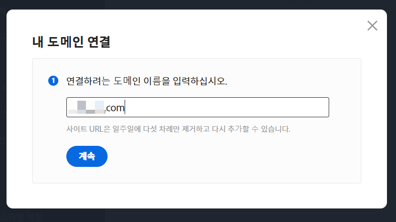 내 도메인 연결 창에서 연결하려는 도메인 이름을 입력하고 계속 버튼을 누릅니다.
