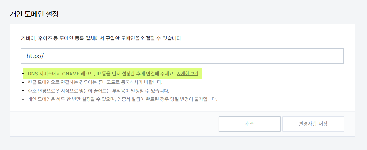 그리고 "DNS 서비스에서 CNAME 레코드, IP 등을 먼저 설정한 후에 연결해 주세요"라는 안내 문구가 있습니다.