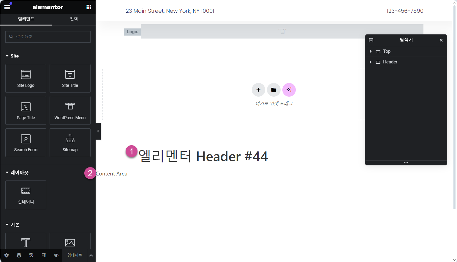 참고로 헤더 템플릿을 만들거나 라이브러리에서 헤더 템플릿을 로그하면 아래 그림과 같이 페이지 제목(예: 엘리멘터 Header #44)과 Content Area 문구가 표시될 것입니다.