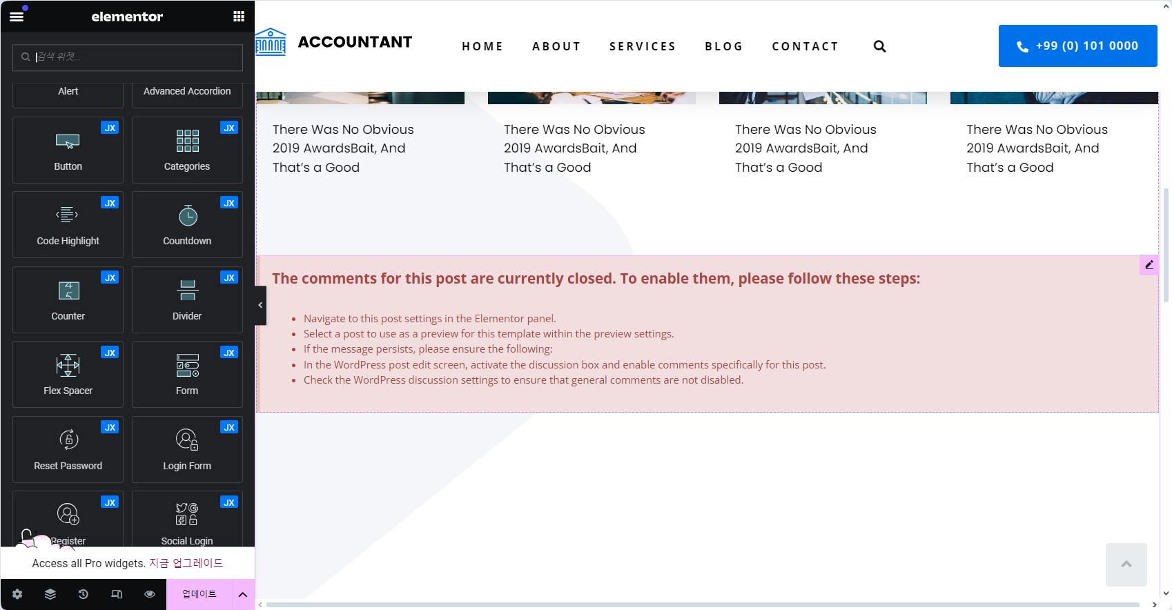 JupiterX의 레이아웃 빌더는 엘리멘터 테마를 이용하고 있고, 주피터에서 자체적으로 만든 위젯을 추가적으로 사용할 수 있습니다.