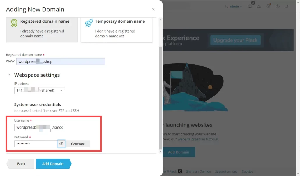 Plesk 앱을 선택하여 서버를 배포하였다면 브라우즈 창에 https://sever-ip-address:8443를 입력하여 플레스크 패널에 로그인할 수 있습니다.