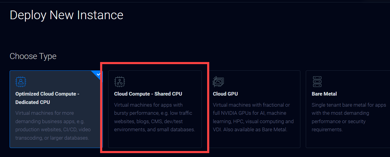 저렴한 요금제의 서버를 생성하려는 경우 Cloud Compute - Shared CPU 타입을 선택할 수 있습니다.