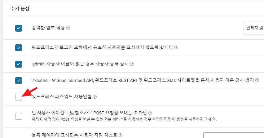 저는 "워드프레스 패스워드 사용안함" 옵션을 아무리 찾아도 워드펜스에서 찾을 수가 없네요.