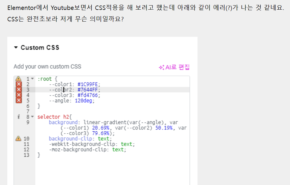 네이버 카페에 엘리멘터에 CSS 코드 추가 시 에러가 발생하는 것에 대한 질문이 올라와서 여기에 대해 간단히 살펴보겠습니다.