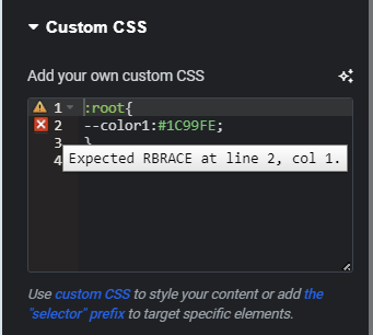 엘리멘터의 Custom CSS 섹션에 :root 가상 클래스로 변수를 정의하는 경우 경고 아이콘이 표시됩니다.