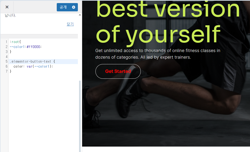 하지만 :root 가상 클래스는 전체 사이트의 사용되도록 고안된 요소이므로 엘리멘터 페이지에 추가하는 대신, 디자인 » 사용자 정의하기 » 추가 CSS 섹션에 추가하는 것이 더 바람직할 것입니다. 그리고 사용자 정의하기에 추가하면 경고도 표시되지 않습니다.