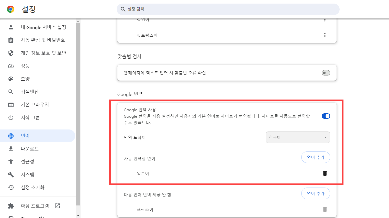 크롬의 설정에서 왼쪽의 언어 메뉴를 클릭하고 Google 번역 섹션의 Google 번역 사용을 활성화하고 자동 번역할 언어를 추가할 수 있습니다.