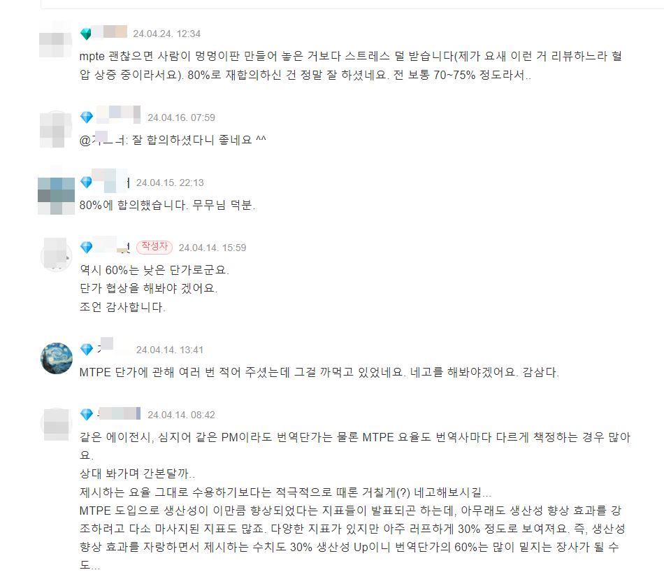 당장 챗GPT와 같은 AI가 번역가들을 대체할 수는 없겠지만, 번역가에 대한 수요가 점진적으로 줄어들고 번역가 수입 또한 계속 하락하지 않을까 염려됩니다. MTPE 단가는 번역료의 60~90% 사이에서 형성되는 것 같습니다. 번역 에이전시와 협상을 잘하여 제대로 된 번역료를 받아야 할 것입니다.