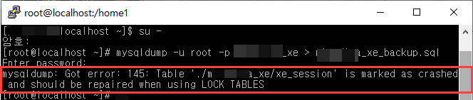 mysqldump: Got error: 145: Table '.../xe_session' is marked as crashed... 오류