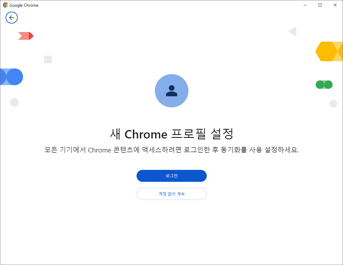새 Chrome 프로필 설정 화면이 표시되면 로그인과 로그인 없이 계속을 선택할 수 있습니다.