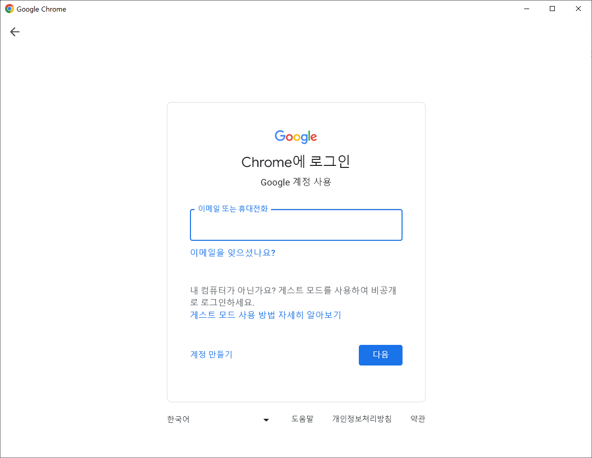 Chrome에 로그인 화면이 나오면 지메일 주소를 입력합니다. 계정 만들기를 클릭하여 새 계정을 만드는 것도 가능합니다.