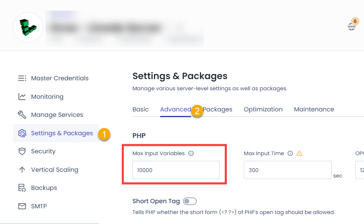그리고 max_input_vars 값을 5000으로 설정하니 이 문제가 해결된다고 하는 사용자도 있습니다. 클라우드웨이즈의 경우 서버 관리 페이지에서 Settings & Packages » Advanced 탭을 클릭하여 Max Input Variables 값을 설정할 수 있습니다.
