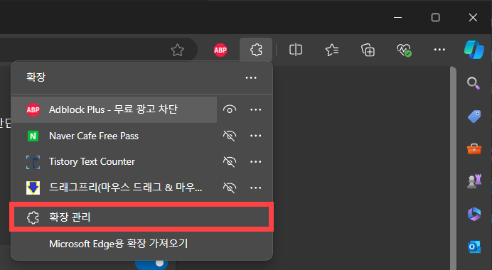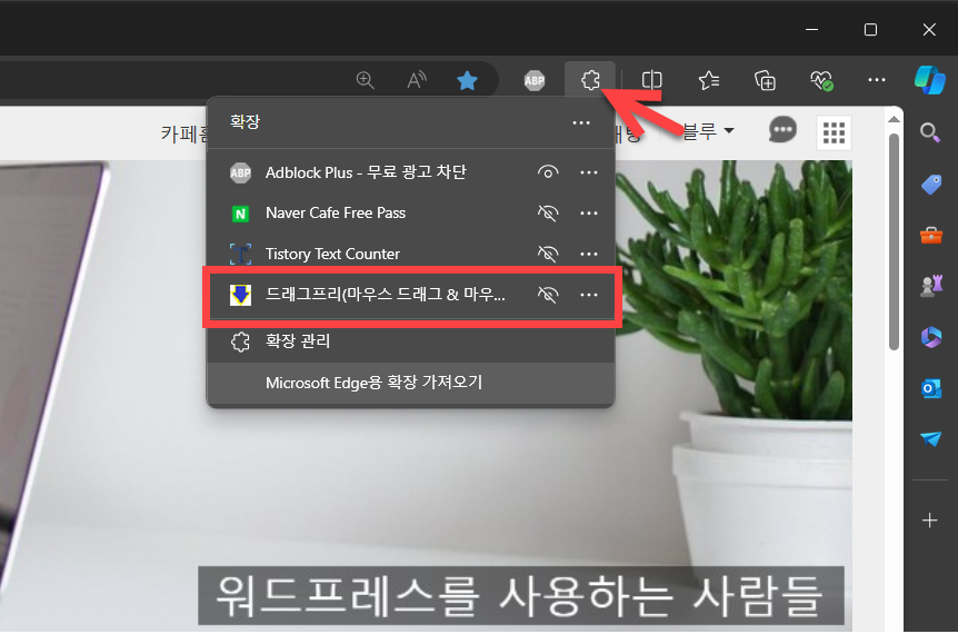 3. 설치가 되면 확장 기능 목록에 추가됩니다. 드래그 방지/우클릭 방지 스크립트가 적용된 사이트를 방문한 상태에서 엣지 브라우저의 확장 아이콘을 클릭하고 드래그프리(마우스 드래그 & 마우...)를 선택합니다.