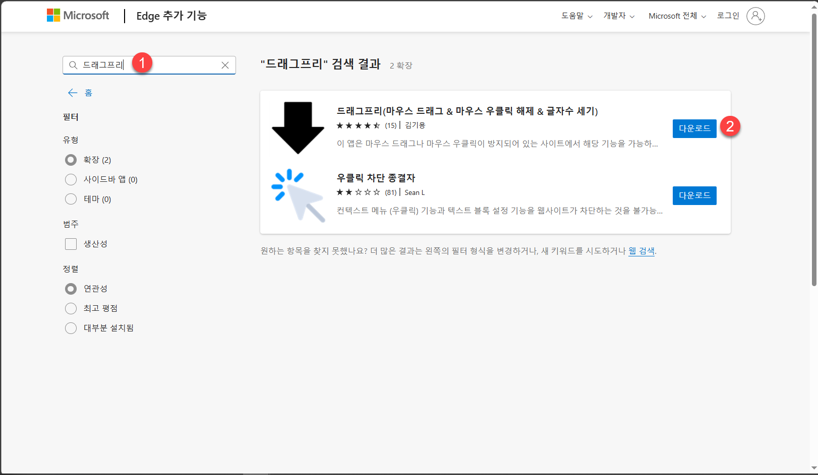 2. Edge 추가 기능 페이지가 표시되면 왼쪽 검색 필드에 드래그프리 또는 마우스 우클릭 해제를 입력하여 검색합니다.