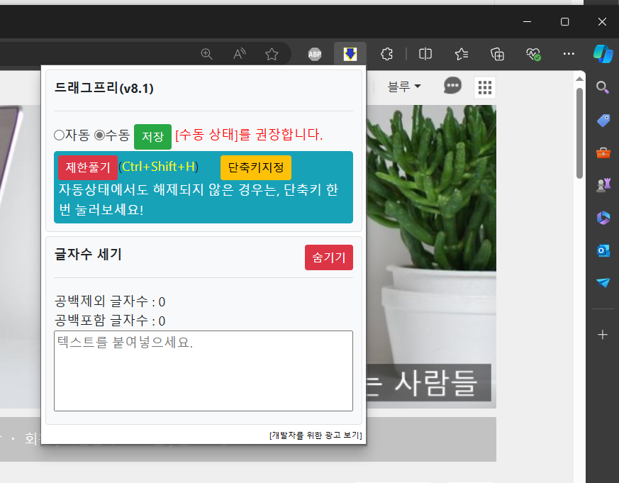 드래그프리(마우스 드래그 & 마우스 우클릭 해제 & 글자수 세기) 확장 기능을 다운로드하여 설치합니다.